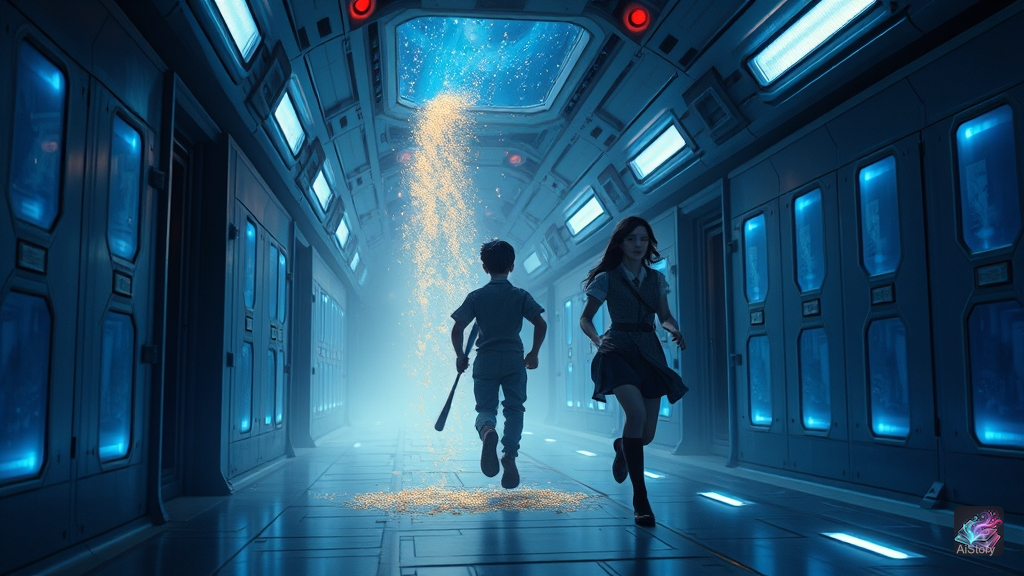 เสียง [click] ของล็อกสุดท้ายดังก้องในสถานีที่เงียบเหงา เอธานกุมมือฮานะแน่น นิ้วมือสั่นระรัว เวลาที่เหลืออยู่มีเพียง [ยี่สิบนาที] ก่อนที่เครื่องปฏิกรณ์จะพังทลาย กลิ่นควันสายไฟไหม้ปนกับจานอาหารเก่าๆ ที่ทิ้งไว้ตั้งแต่การประชุมครั้งสุดท้ายลอยคลุ้งในอากาศ 'เราต้องไม่ล้มเหลว' เขากระซิบ น้ำเสียงสั่นเครือ ฮานะพยักหน้า ดวงตาเบิกกว้างด้วยความหวาดกลัว แต่พยายามยิ้มให้กัน เธอนึกถึงวันแรกที่ทั้งสองเกิดมา หัวใจสองดวงเต้นเป็นจังหวะเดียวกันใต้สายฝนดาวตกอันศักดิ์สิทธิ์ แต่ตอนนี้ ชะตากรรมของพวกเขาแขวนอยู่บนเส้นด้ายบางๆ ปัญญาประดิษฐ์ของสถานีที่เคยอ่อนโยน กลับพูดด้วยน้ำเสียงเย็นชา: 'เริ่มโปรโตคอลฉุกเฉินแล้ว ผู้คนที่ไม่จำเป็นต้องอพยพทันที' แต่พวกเขาไม่ได้อพยพ พวกเขาจะไปหยุดความมืดมิดนั้นให้ได้